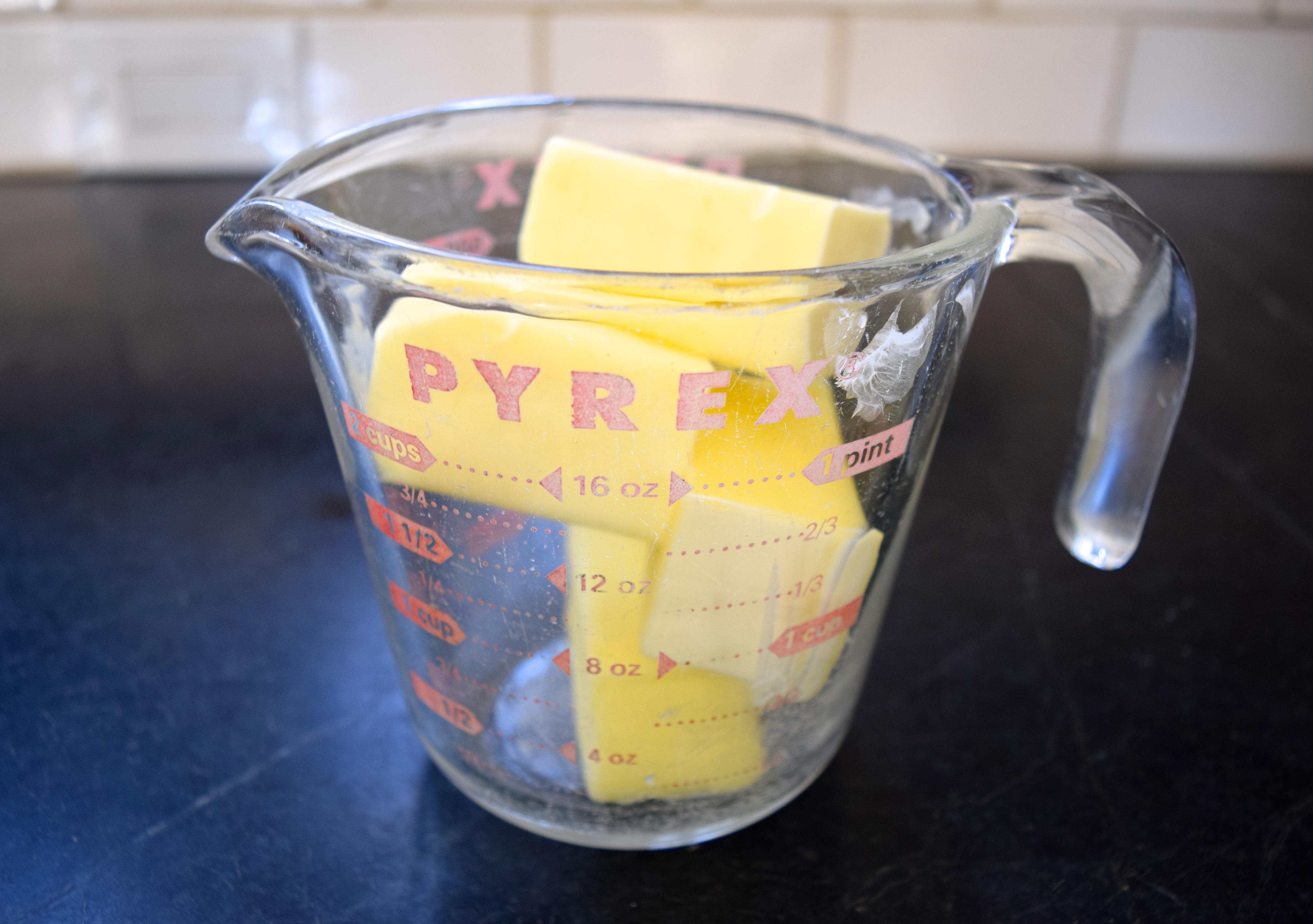 To melt butter: Place butter in a tempered-glass liquid measuring cup. Melt butter in the microwave for 20-30 seconds. If little flecks of butter remain after melting, that is okay; better to let them melt on their own than risk overheating and causing the butter to separate into fat, water, and milk solids.