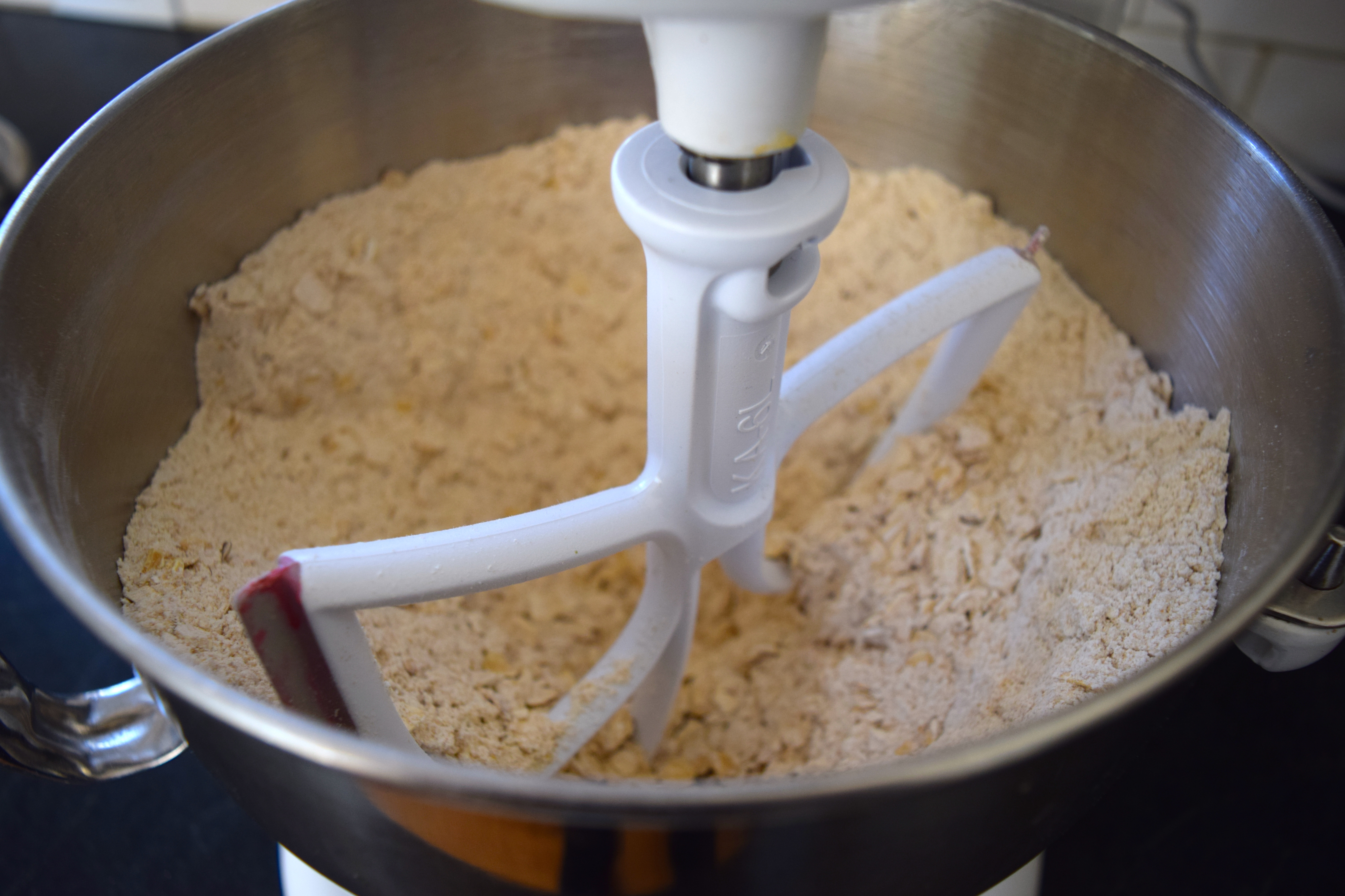 Into a large mixing bowl, add the dry ingredients: the flours, baking soda, salt, sugar, ginger, and oats. Mix on slow speed for about 30 seconds.