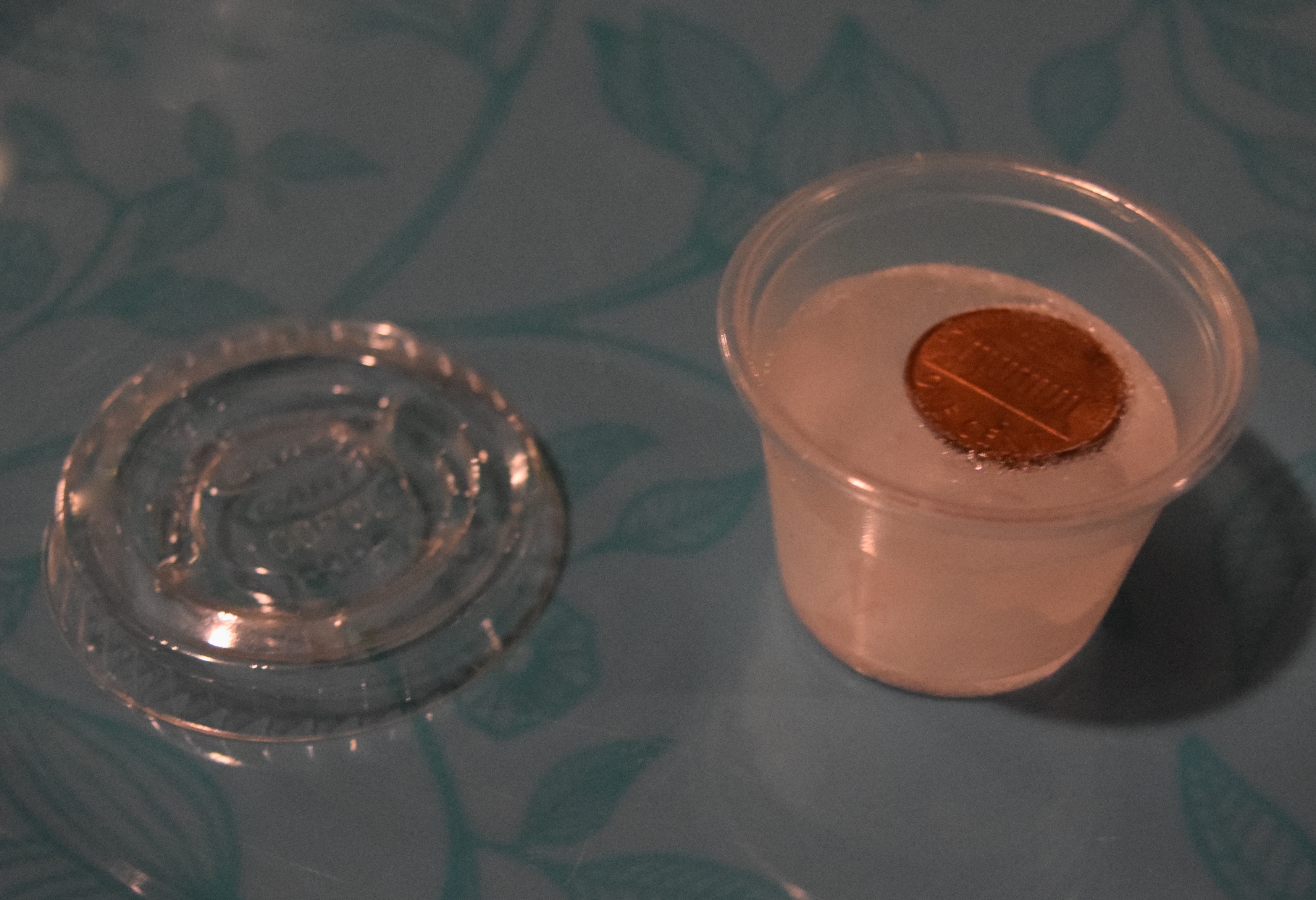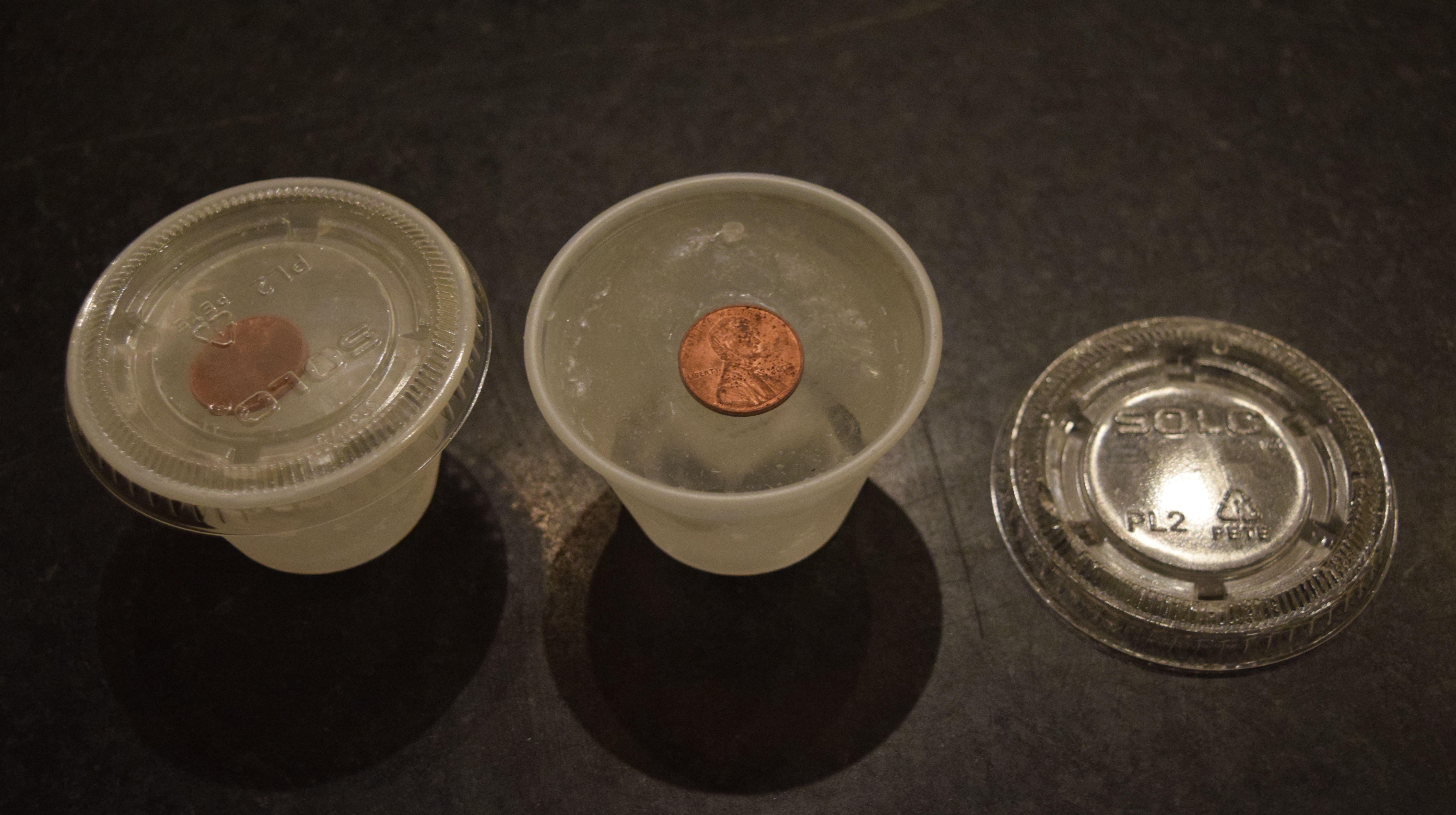 When water is frozen, place a coin on top of the ice and put the lid on.
