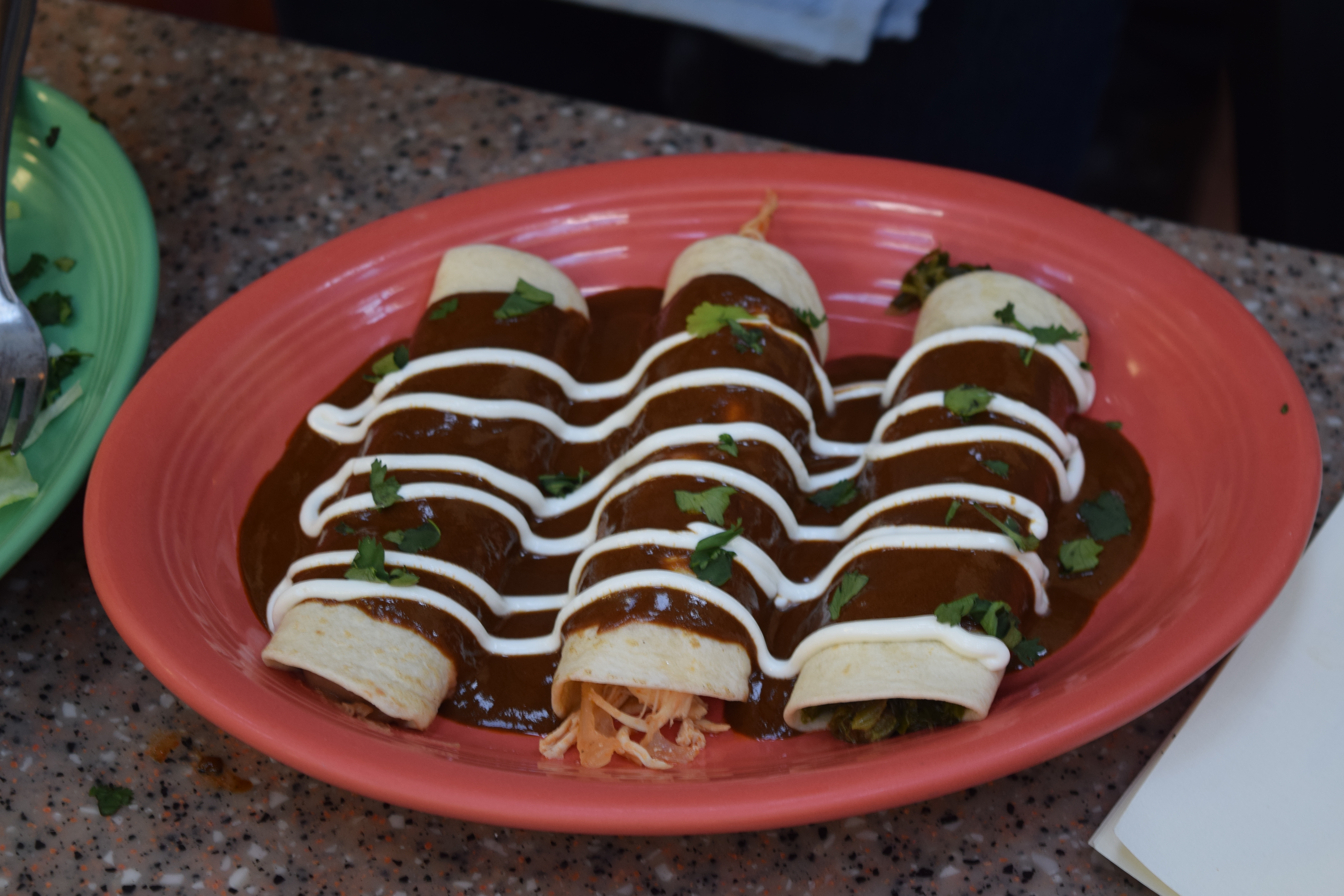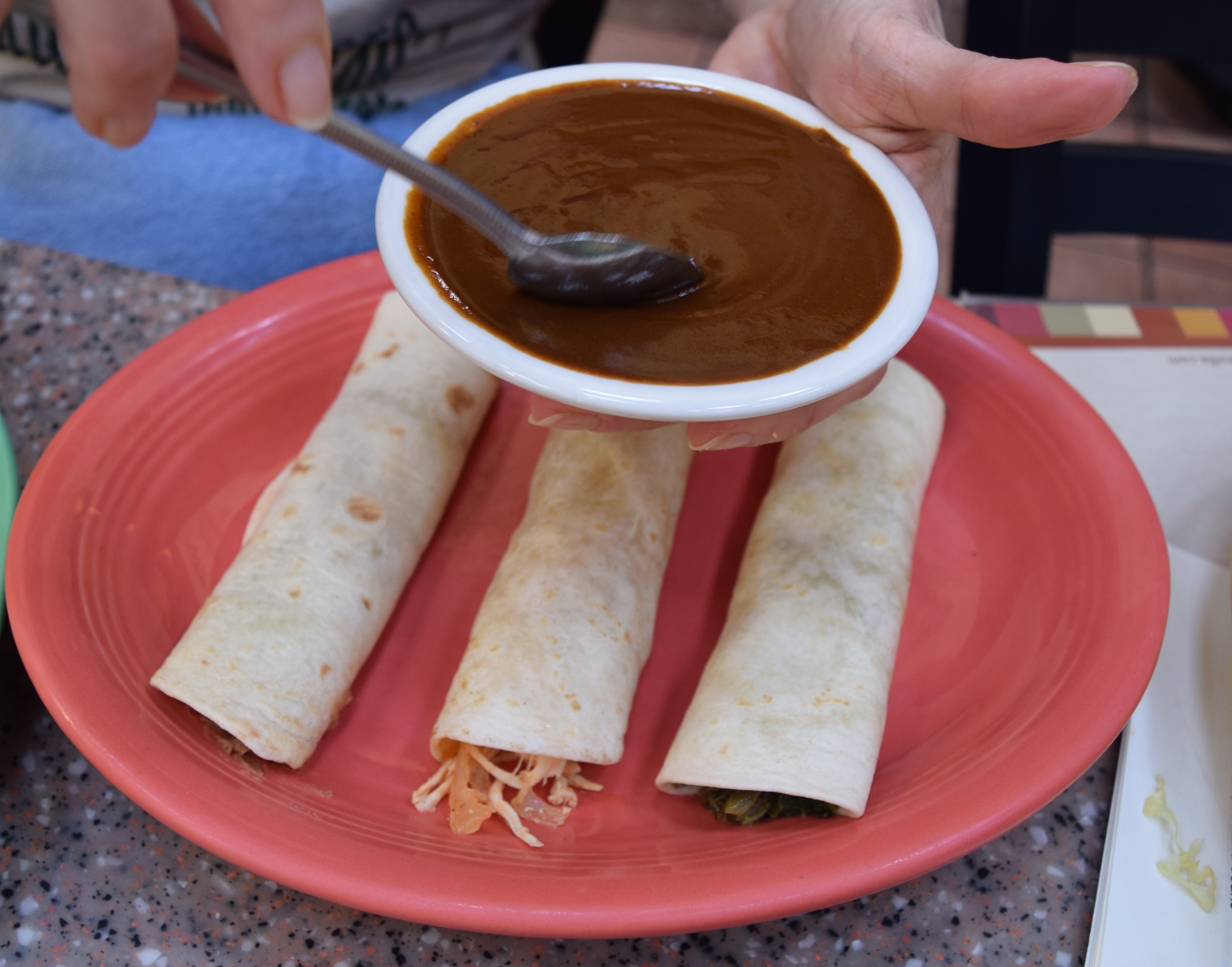 Mary used a piping bag, filled with sour cream, to decorate the enchiladas.