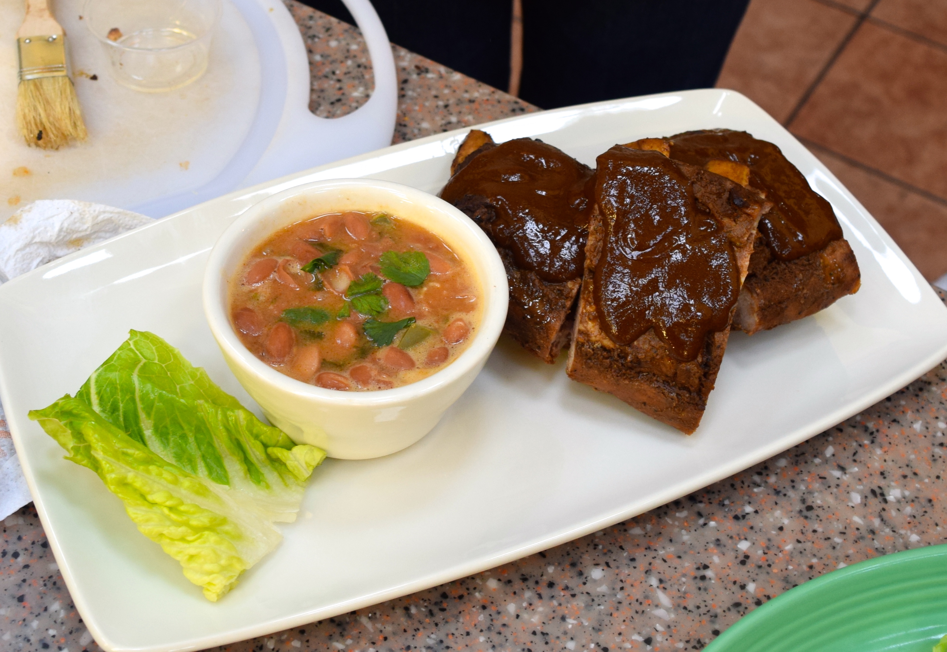 Mary cut this tamale entree in half and then carefully placed the beans and gravy around the plate. This is another example of keeping your angle of view in mind as you stylize food.