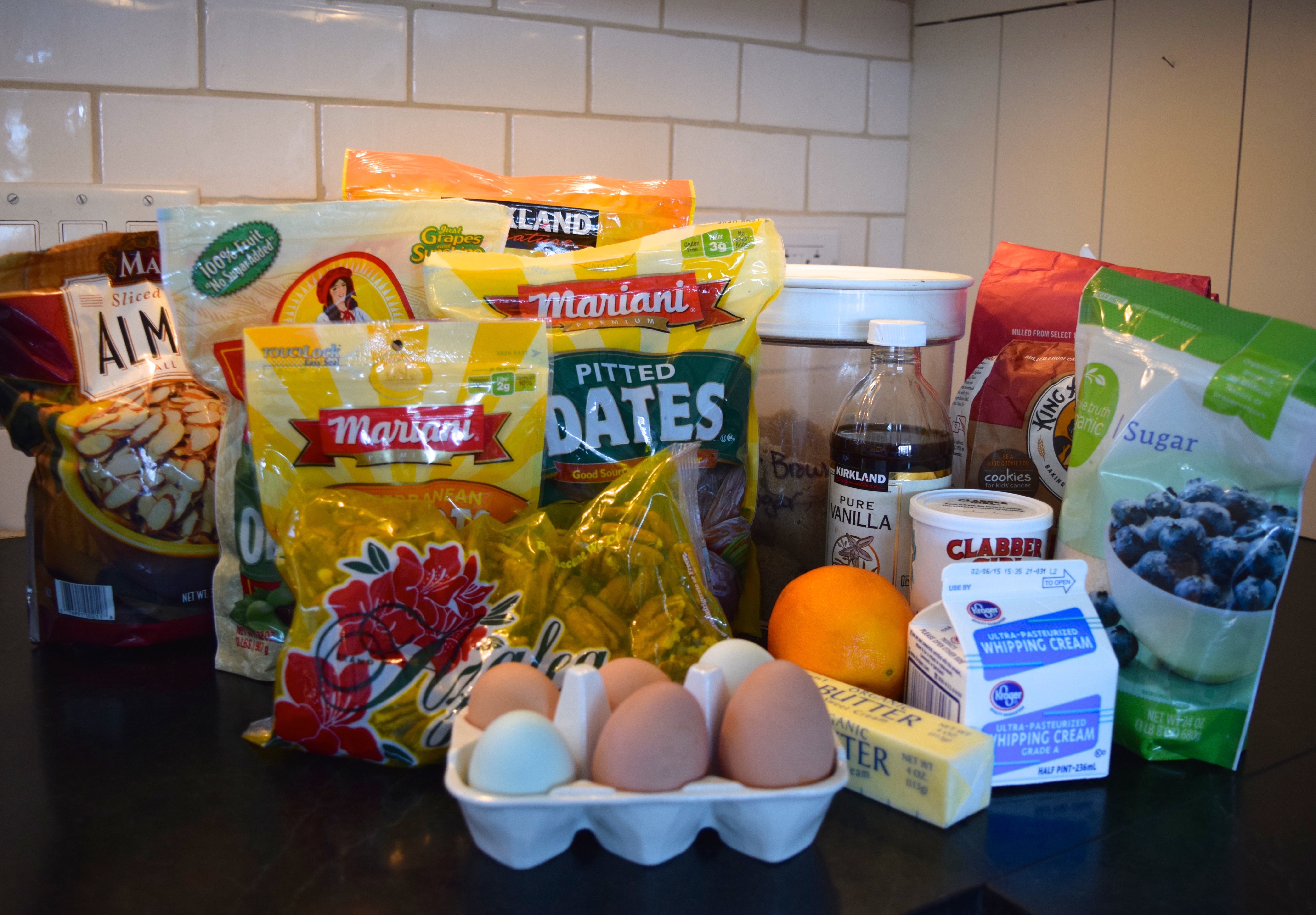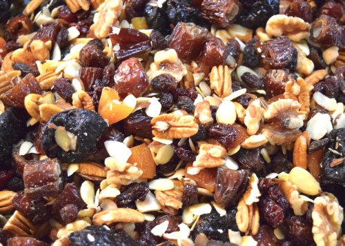 I keep large bags of dried fruits and nuts in the pantry. When it comes time to make this recipe, I pour a good mix of them into a bowl placed on a digital scale and keep adding more until the scale reads 3 pounds, 4 ounces. Then I pour in the nuts until the scale reads a total of 5 pounds.