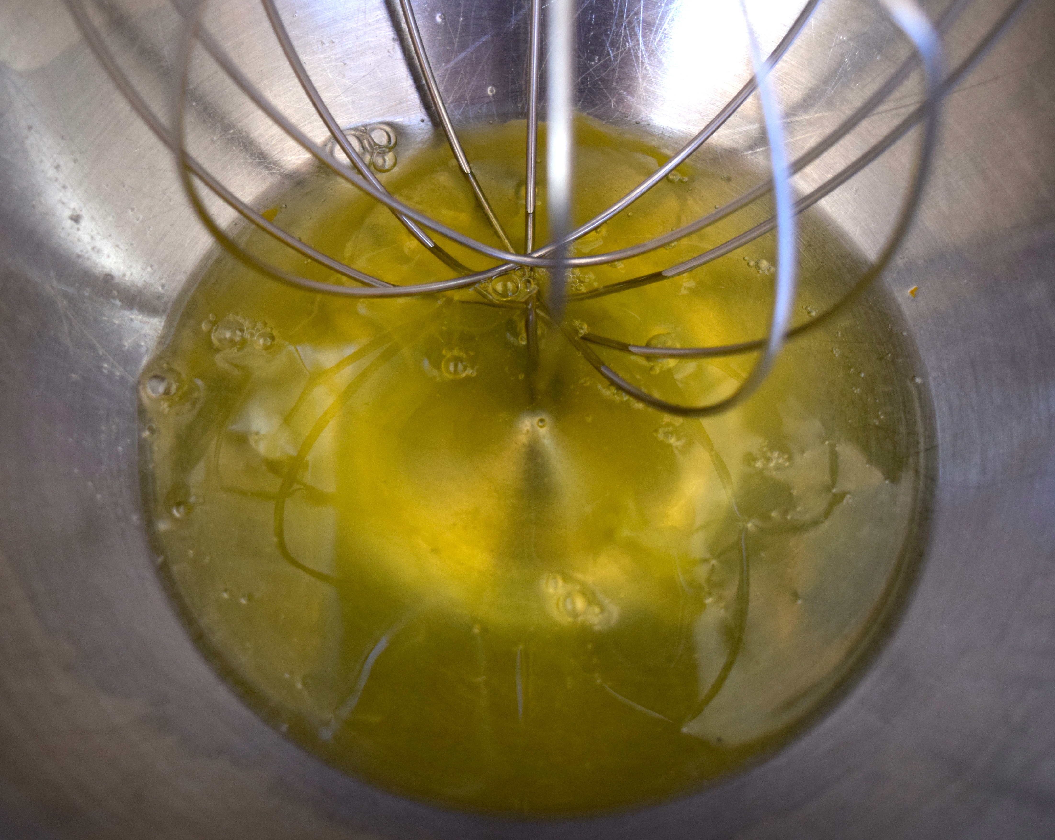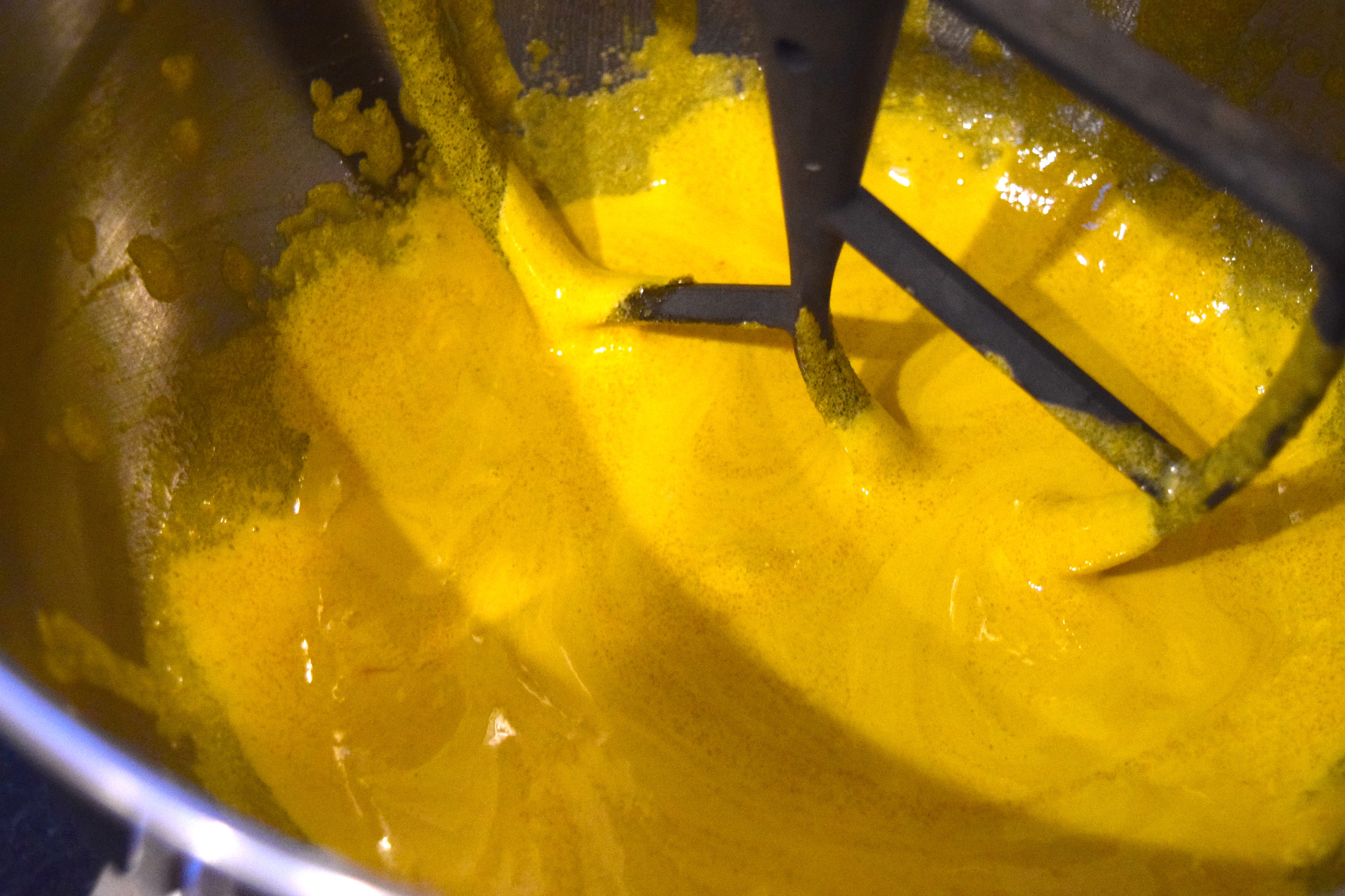 Next, add the eggs and sugars to the mixing bowl. There is no need to wash the bowl first. Cream ingredients together for 2 minutes on medium-high speed.