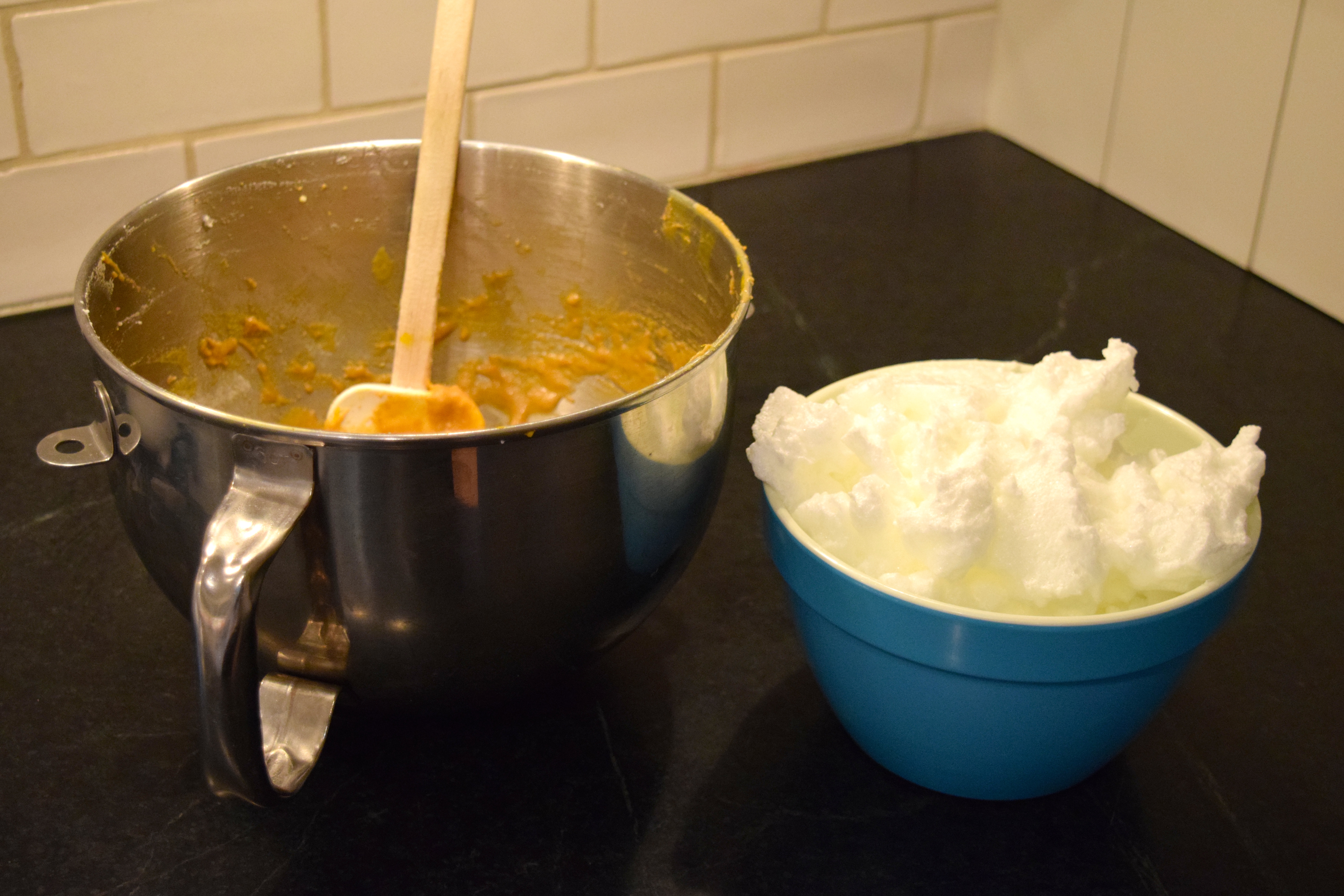 Now you have a bowl of batter and a bowl of stiff egg whites.