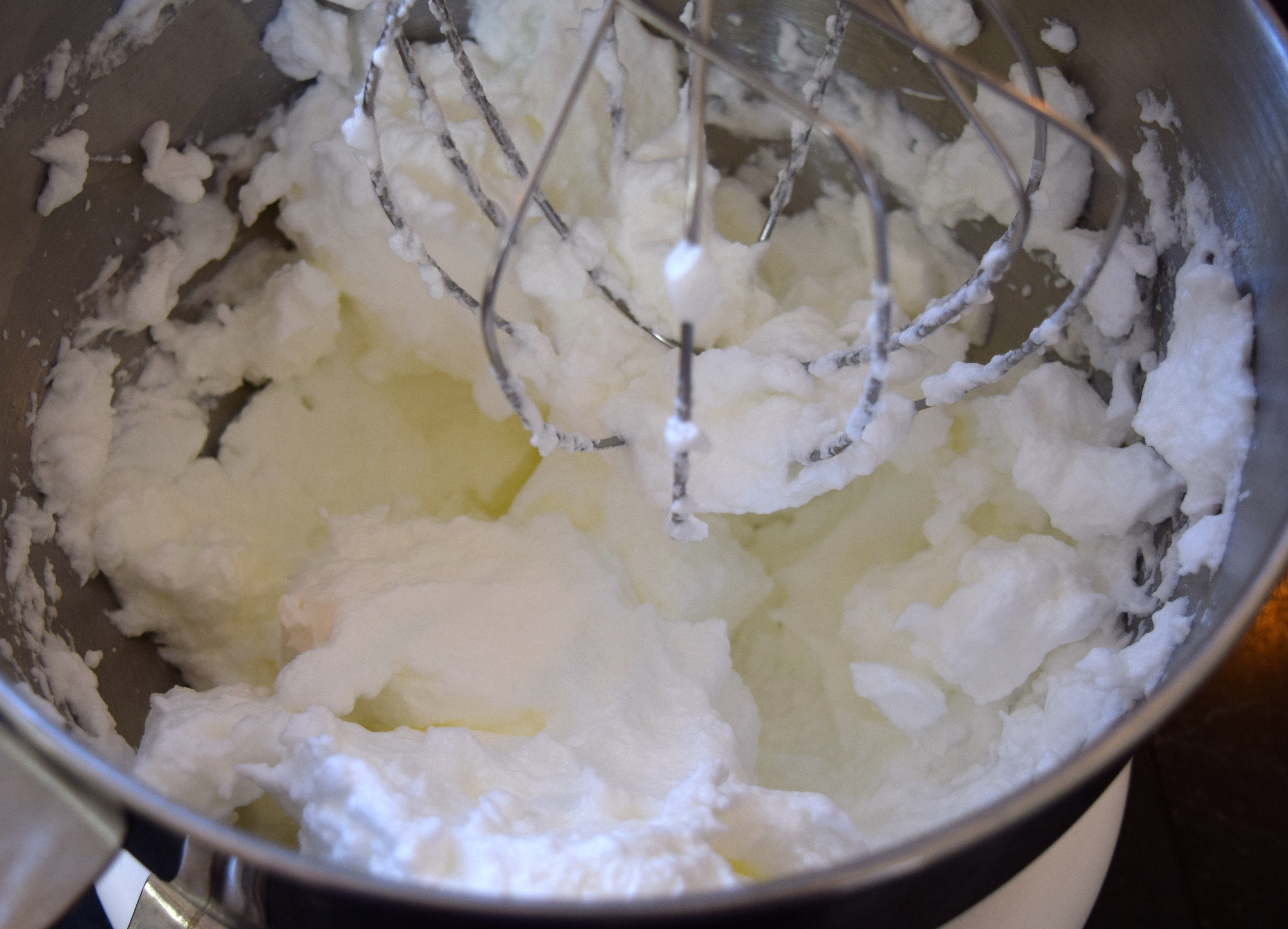Beat egg whites on high speed in a clean, dry, mixing bowl until the whites puff up and form peaks. Don’t overbeat the egg whites. Use a rubber spatula to gently move the beaten whites to another bowl. Set aside.