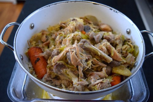 Using a slotted spoon, remove the thighs. Once cool enough to touch, pick off the meat and refrigerate until later.
