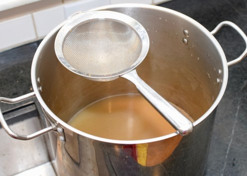 Return bones, cartilage, and skin back to the stockpot. Simmer for a minimum of 5 hours. Strain through a colander positioned over a large container.