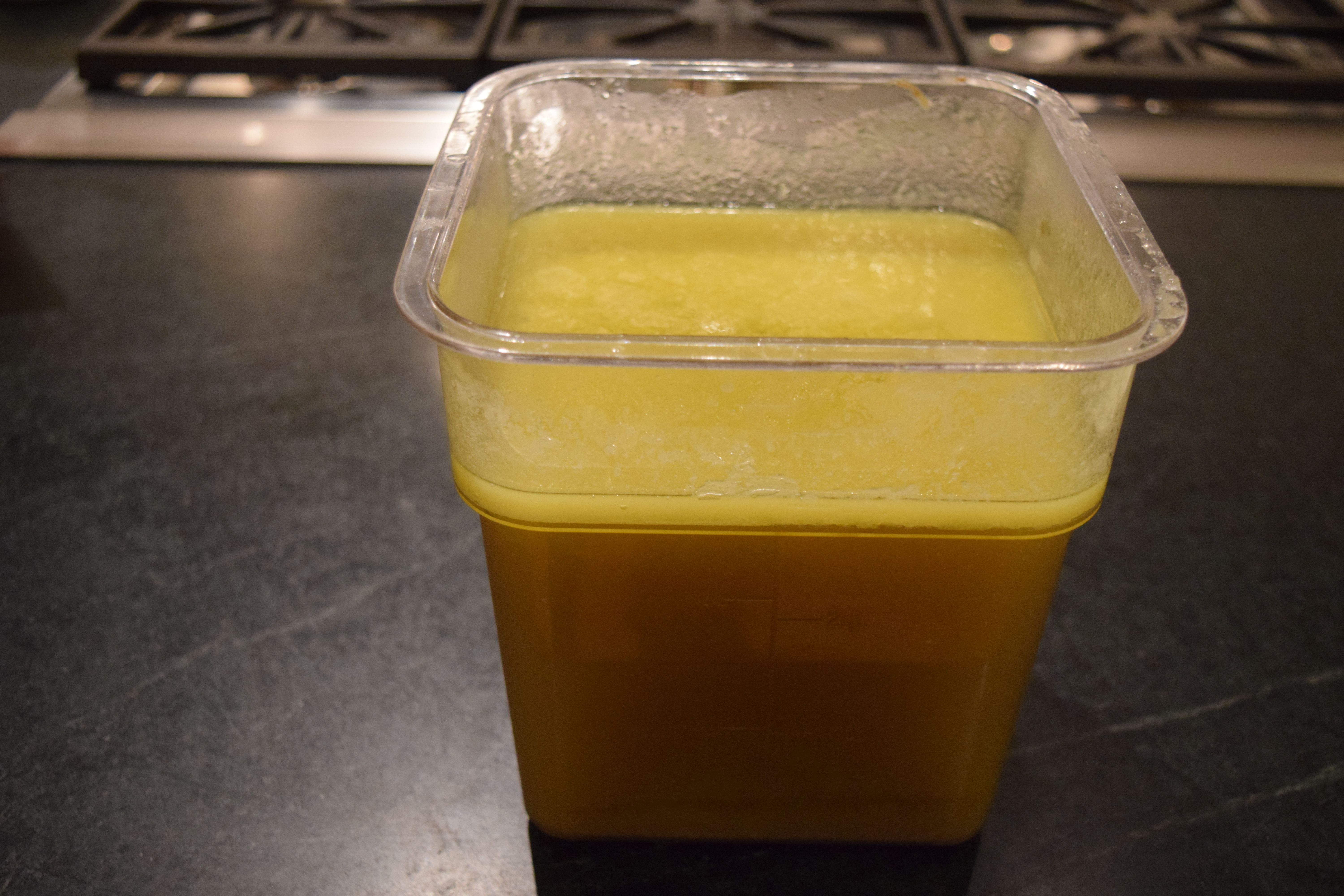 Bones, cartilage, and connective tissue contain a protein called collagen. As the bones simmer in water, the collagen breaks down, and once chilled, congeals into gelatin. This gelatin is your goal in broth-making. If the broth is not cooked long enough or is too dilute, it will not gel up like this.