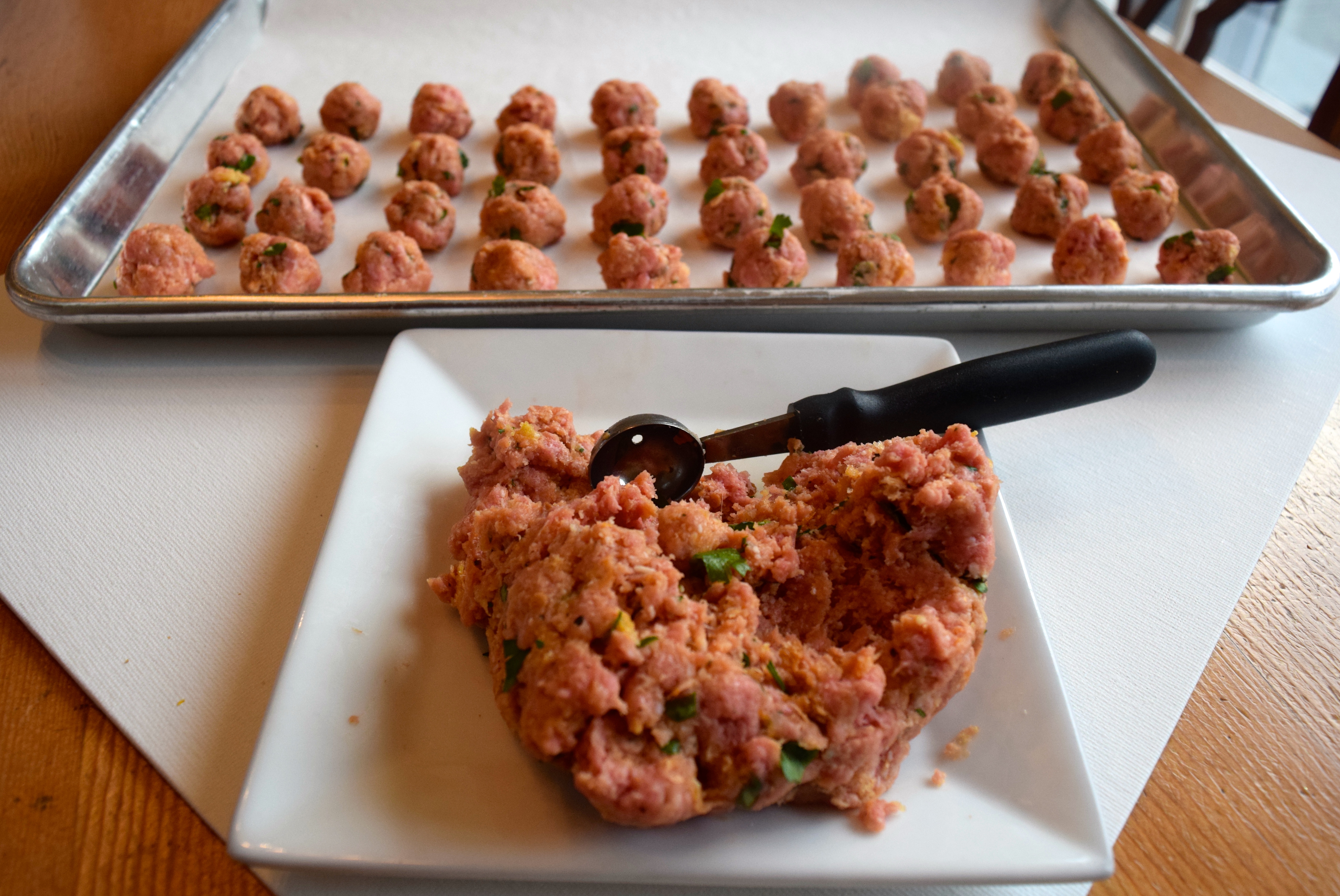 Use a melon scoop to make bite-sized meatballs. Place on a 13″ x 18″ rimmed sheet pan. The meat mixture weighed 1½ pounds. From that, I made 70 meatballs. Set aside.
