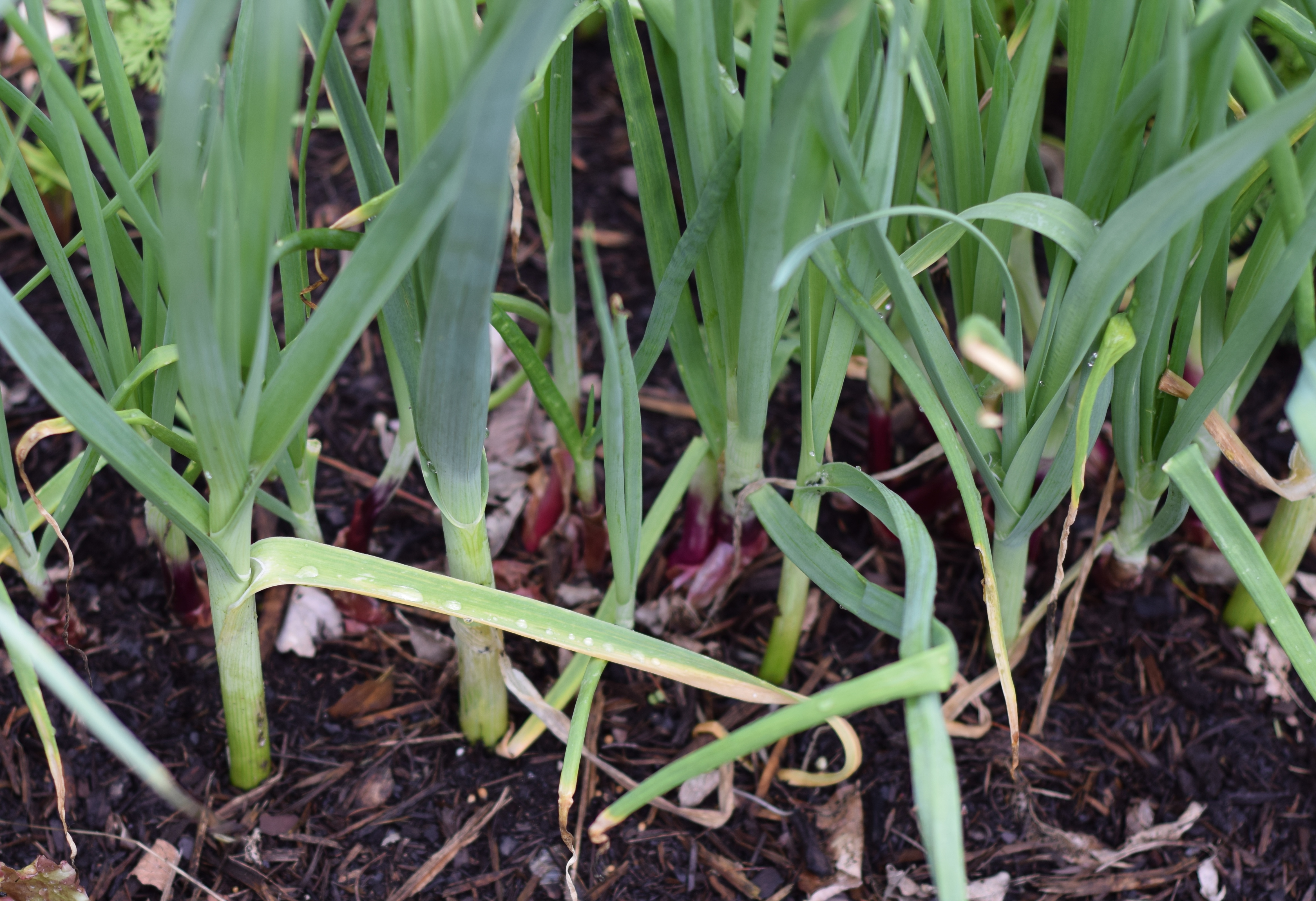 I planted two rows of onion “sets” on 9/1 and two rows of onion seeds on 8/24 (on the right side). If you look closely, you can see the faint strands of green seedlings. Unfortunately, the young seedlings didn’t make it through the winter. We started harvesting green onions from the sets in November and continue to do so even now.