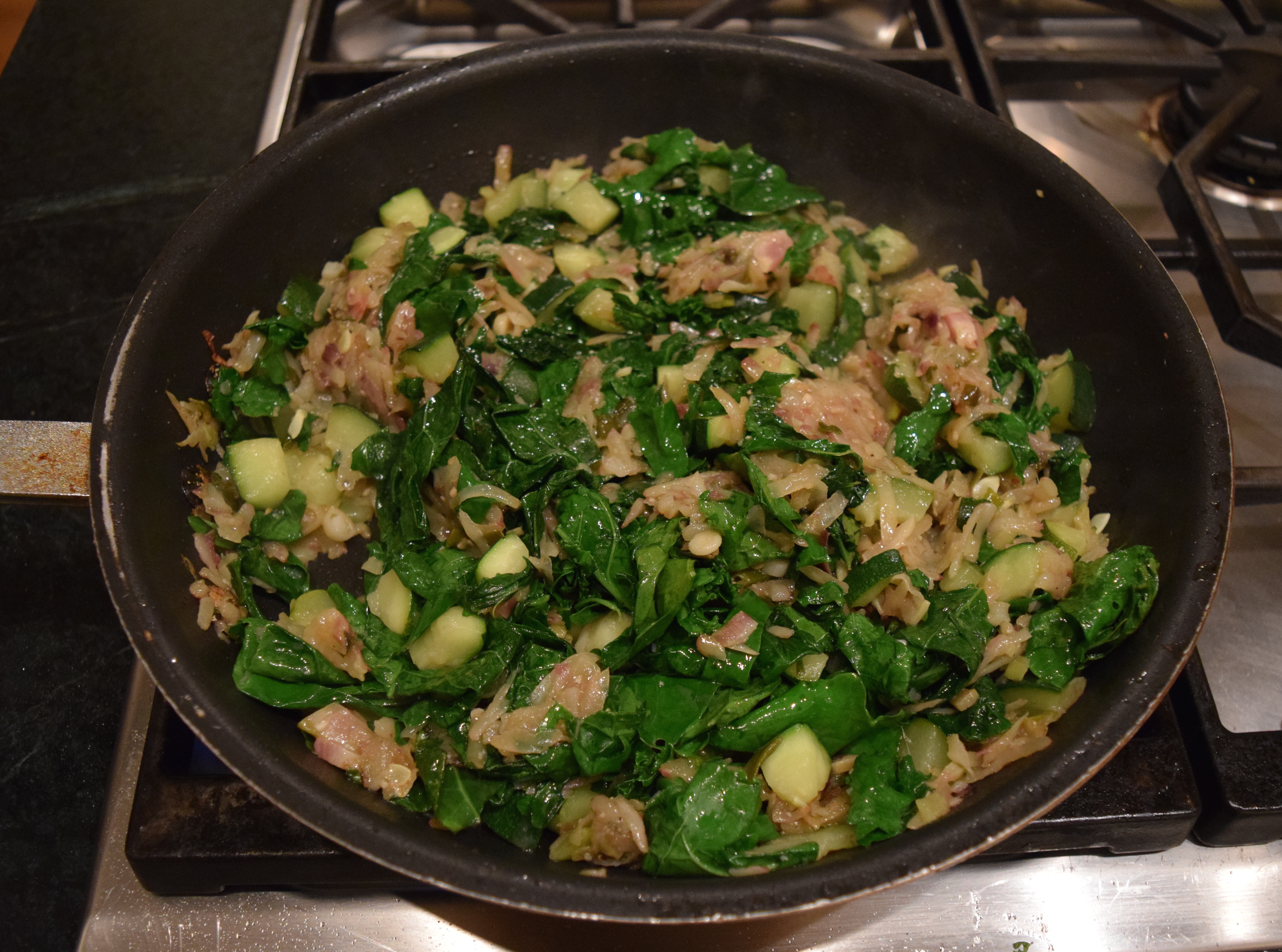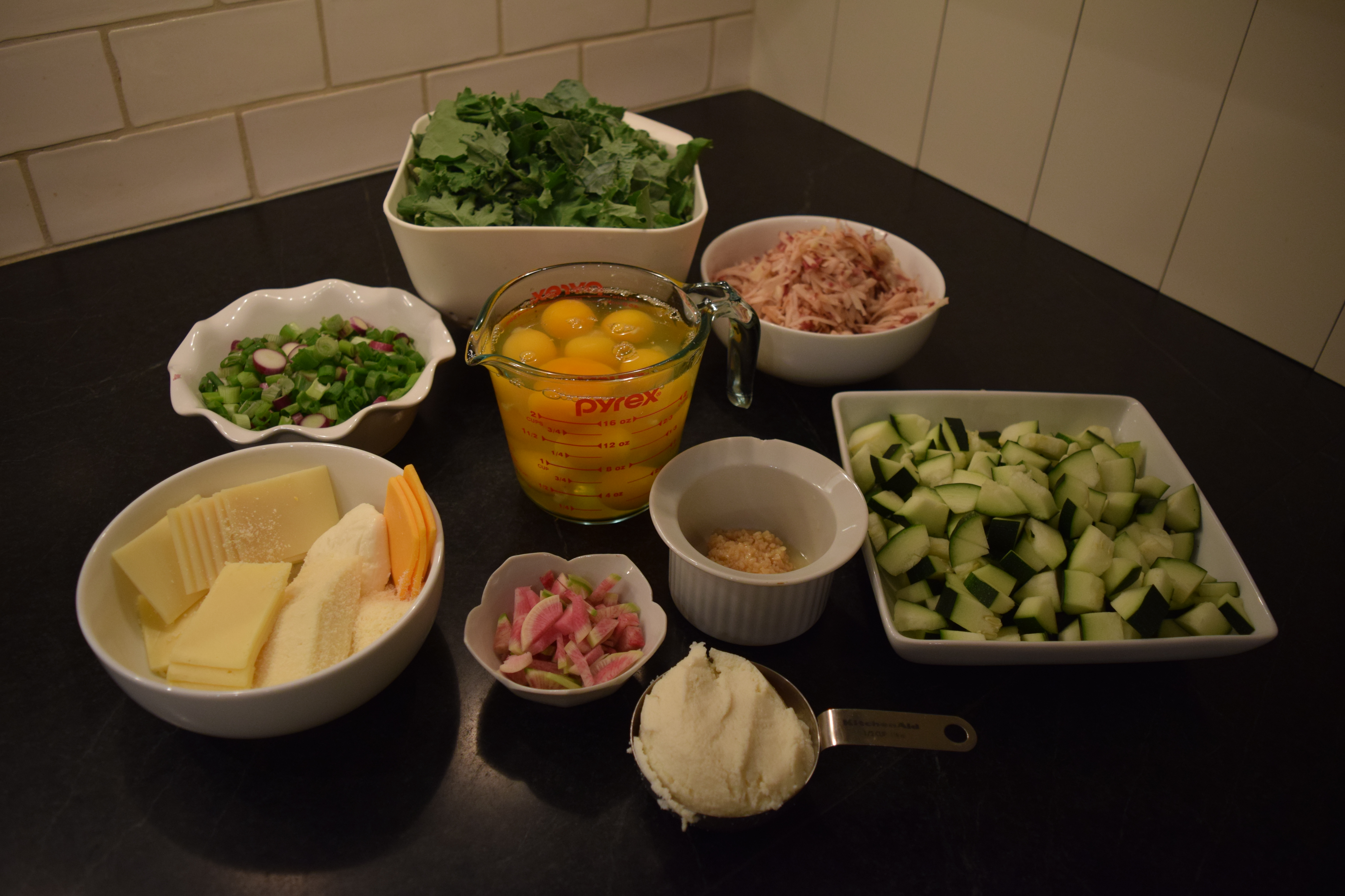 This was one day’s pickings from the garden. I decided, as a trial, to throw all of it into the frittata along with dairy ingredients to see if it would work. I tried fresh kale. It was delicious.