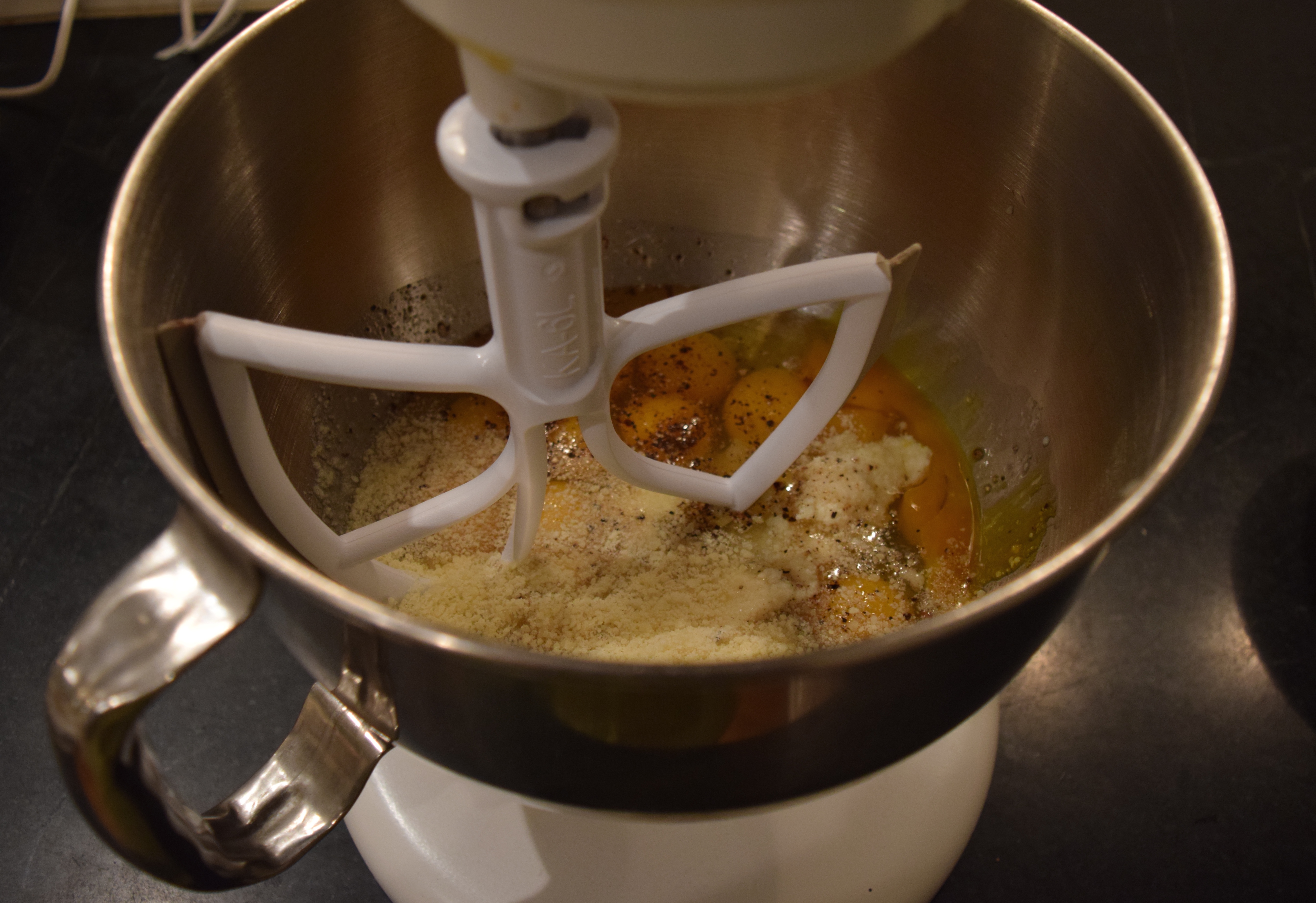 12 eggs, 1/2 cup ricotta, 1 teaspoon salt, 1/2 teaspoon pepper, 1 cup Parmesan, 2 cups mozzarella