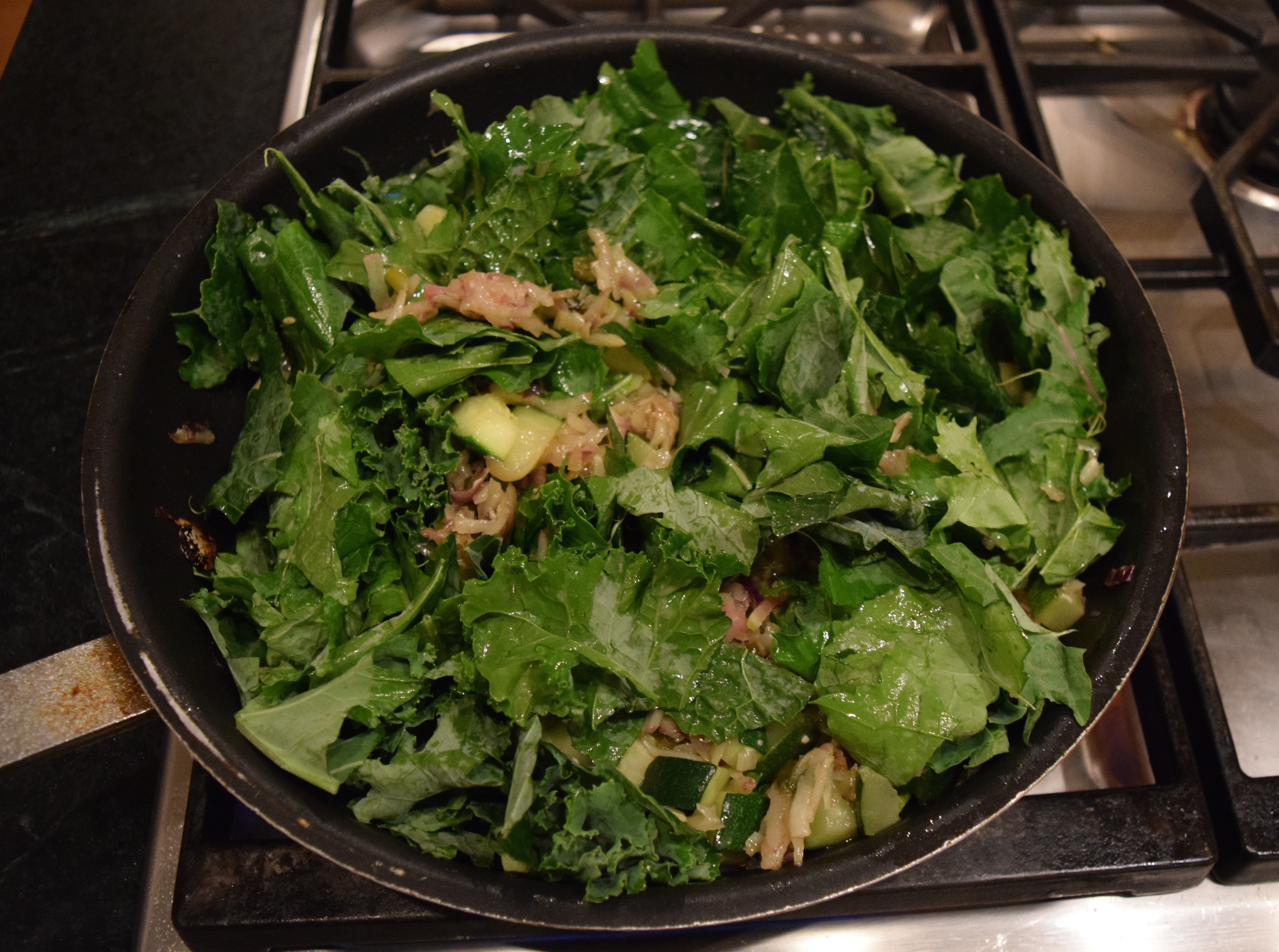 I tore the leaves into 3-inch pieces, added them to the vegetable sauté last, and cooked them for one minute until wilted. Chard, collards, or spinach would also work well here. Be sure to remove the thick stems from the collards or chard.