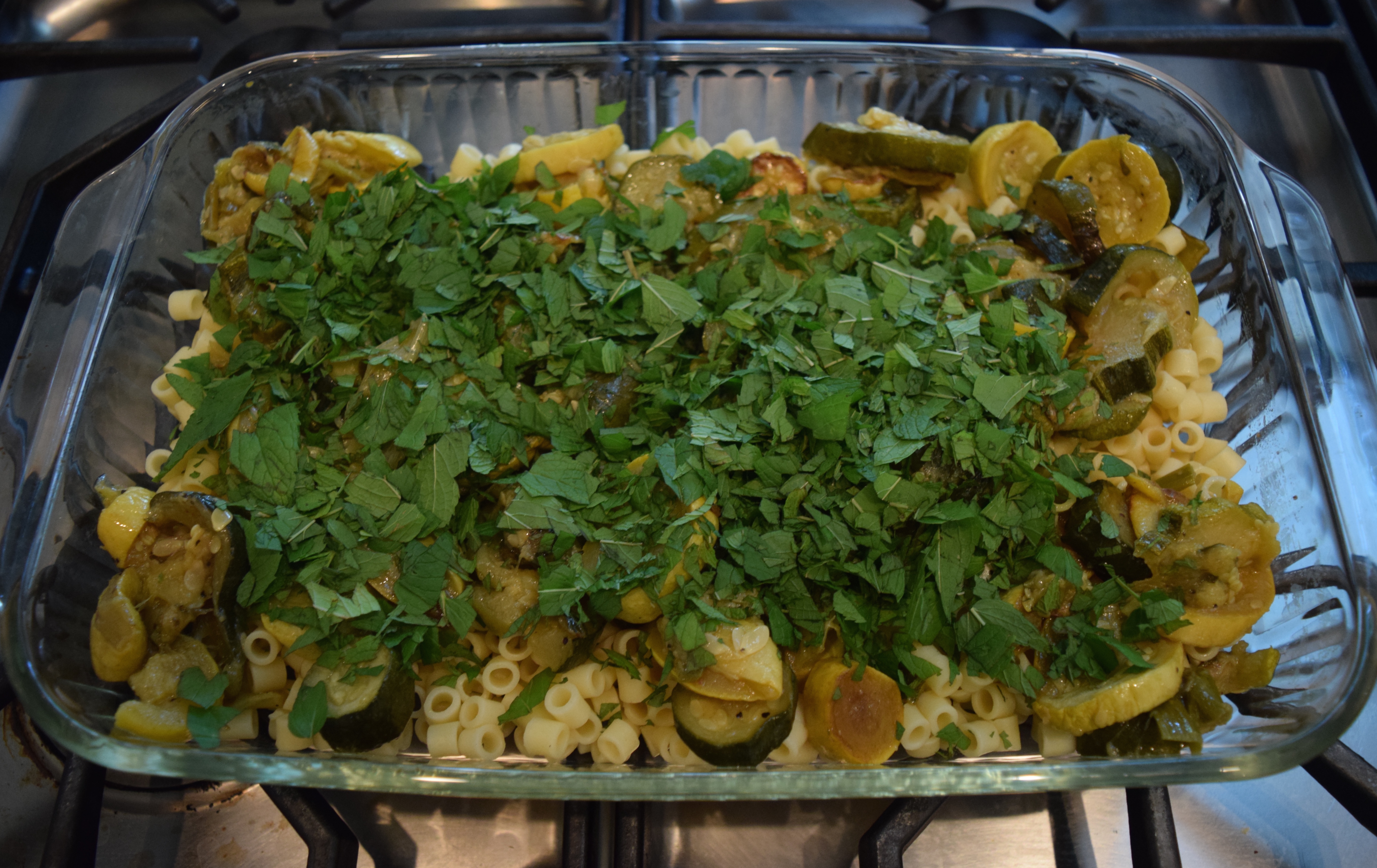4 cups cooked pasta, 4 cups roasted zucchini with leeks, 1/2 cup chopped mint