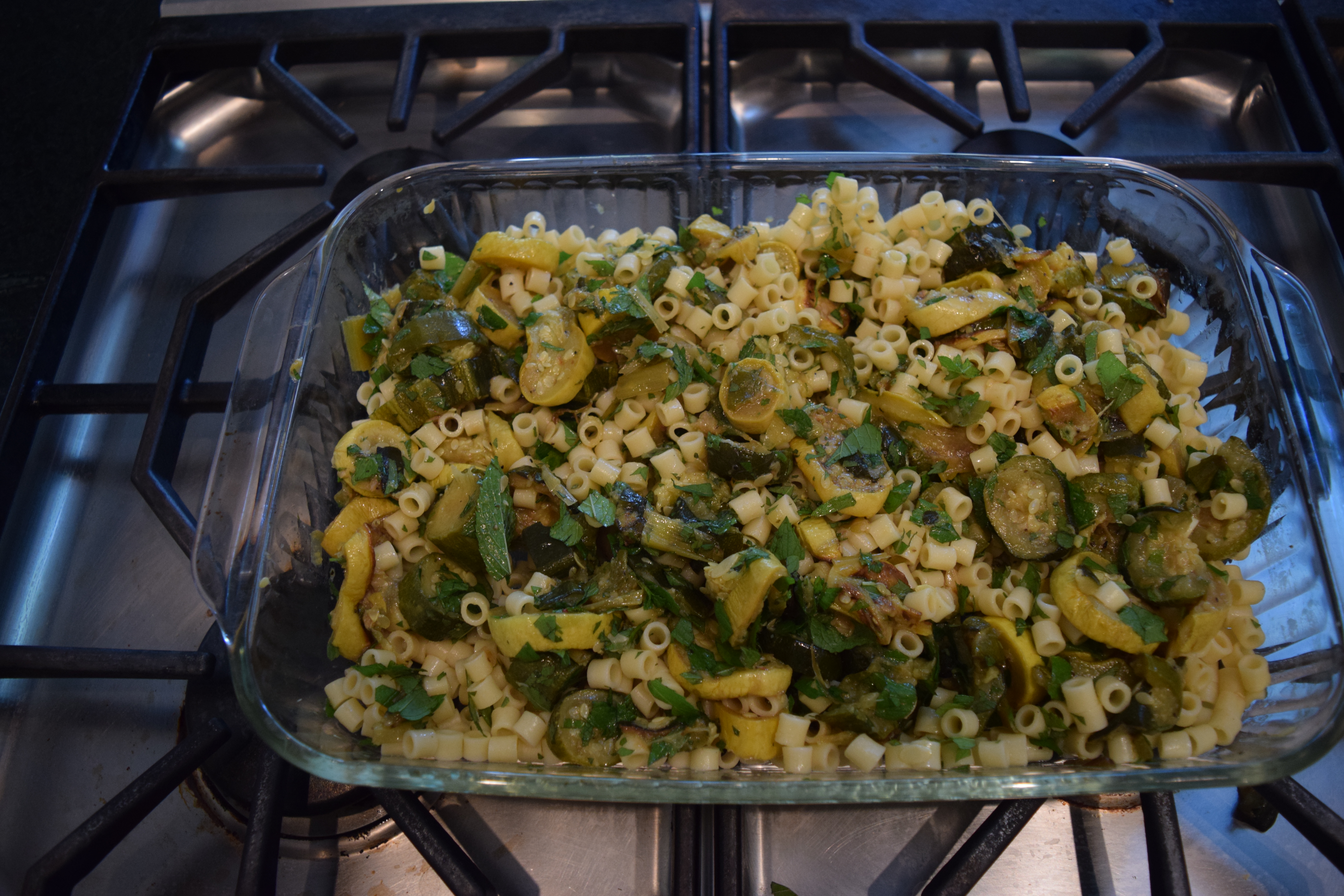 Another frittata version: leftover ditalini pasta and roasted zucchini, summer squash, and leeks, with fresh, chopped mint