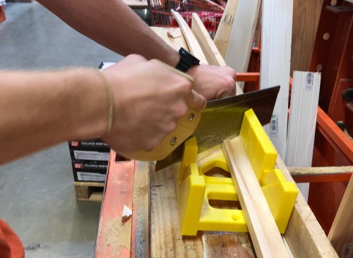 My husband took the two six-foot long trim strips and used a miter-block to cut them down to the proper size which was previously measured to fit around the plywood exactly.