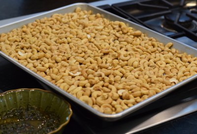 Pour nuts into a large, rimmed, baking pan in a single layer. Roast for 10-12 minutes until very lightly browned.