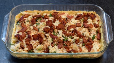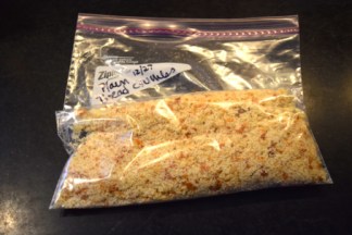 I’m not going to lie about the amount of prep work needed for this recipe; this pie takes time. I streamlined the process by buying already shredded mozzarella and parmesan cheese and by using homemade breadcrumbs from a stash in the freezer. As a time-saver, you could forego the homemade cheese crust and use a single layer, pre-made roll of uncooked dough, reshaped to fit in a 9 x 13 pan. Or, you could make the cheese crust version the day before and store it uncooked in the fridge.