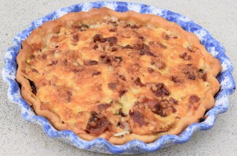 Here’s what you have now: tomatoes, cheese and onion mixture, bacon and cooked cheese pie crust.