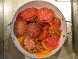 Slice tomatoes about ⅓ inch thick. Place in a colander, add 1 teaspoon of salt and gently mix to distribute the salt. Place a weighted object on top of the tomatoes to help squeeze out the juice. I put a collection bowl under the colander to capture the juice and save for something else (like soup broth). Gently stir and squeeze the tomatoes every 5 or 10 minutes. Let them continue to drain while you finish the prep work.