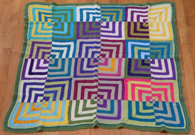 The first item is my favorite blanket pattern, the “Mitered Square Blanket” from Mason Dixon KnittingI started the pattern when my daughter-in-law first told us she was pregnant. Because we didn’t initially know the sex of the baby, I made the first squares in shades of pink and blue.