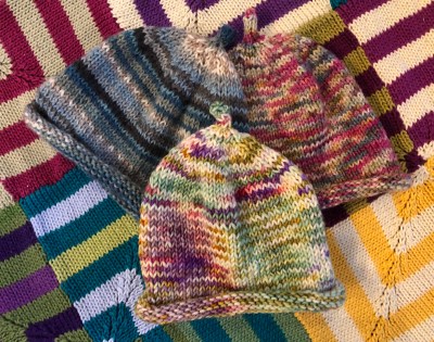 The variegated pink yarn on the hat on the right is by the Sheep Shop Yarn Company. It is an old yarn made with a blend of silk and wool. It is no longer available.