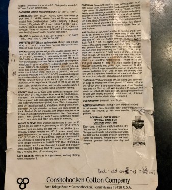 The Home Team Player sweater pattern came from the now-defunct Conshohocken Cotton Company and has been my favorite baby sweater pattern since the 1980s. The pattern is nowhere to be found for purchase on the Internet or in stores, so I’ve included it in this post. My pattern looks like an old family recipe. It is as well-loved as Mom’s Apple Pie!