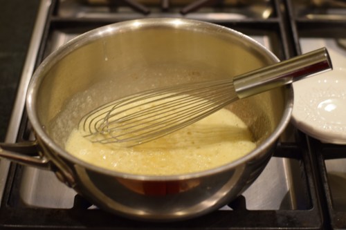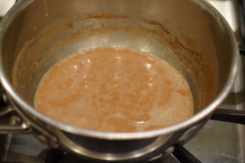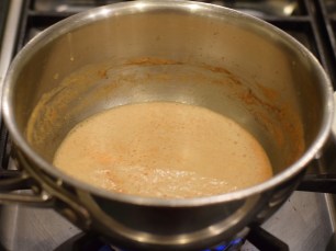 Stir continuously over medium heat until the roux starts to change color, usually about three minutes, give or take a few seconds. The picture on the left was taken at 2½ minutes. The one on the right was taken at three.