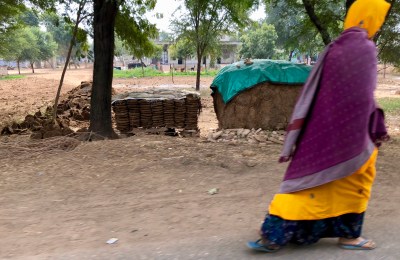 We passed brick-firing chimney stacks frequently as we traveled the farm roads. When we saw laborers in the process of mixing clay and water to make bricks, we asked Ravi to pull over.