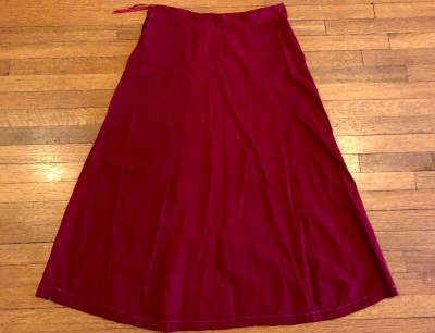 Step one is to put on a long petticoat that has a drawstring. The drawstring needs to be tied tightly as it is what holds up the “skirt” portion of the saree when it is wrapped around the waist. Sarees are usually 4 to 5 feet wide. The length of the “skirt” is adjusted by tucking the excess fabric into the petticoat’s waistband.