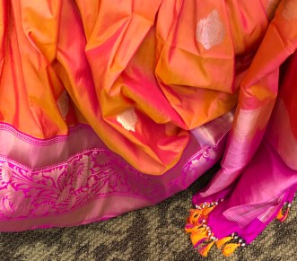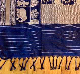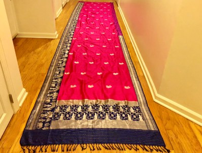 I laid my six-yard-long saree on the floor so you could see that one end of it is more decorative than the other. The decorative end is called the pallu and is the portion of the saree that will be draped over a woman’s shoulder where the design can be seen. The less decorated end is the part that wraps around a woman’s waist and covers her legs.