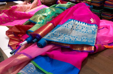 Woven into the pallu end of a saree is an extra yard of coordinating fabric that is left there to make the matching blouse. Note the solid red fabric the employee is holding.