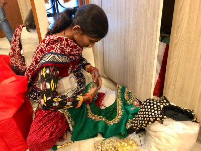 When making blouses for weddings, the finishing requires a lot more handwork. In the photo below, the blouse fabric is stretched onto a frame to keep it taut while a finisher embellishes it with beads.