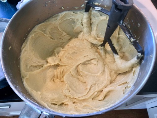 Pour the wet ingredients into the butter and flour mixture and beat on slow speed for one minute. Scrape down the sides of the bowl with a spatula. Beat the batter on medium speed for one minute until smooth and fluffy.