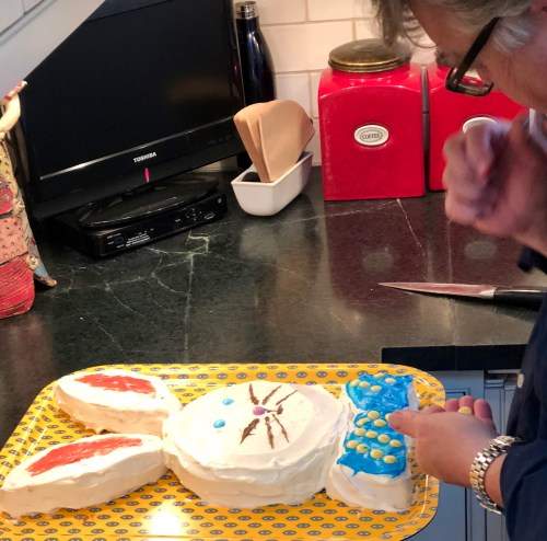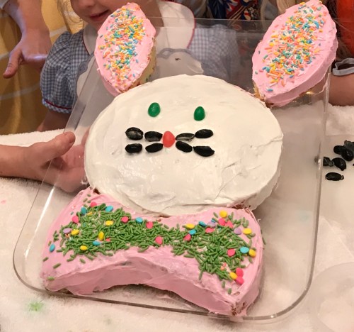 Meanwhile, a few miles away at my Goddaughter Leigh’s house, my dear friend Becky was busy making an Easter Bunny Cake for her three-week-old granddaughter. She sent me a photo.