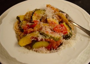 I roast zucchini, eggplant, onions, and tomatoes together when I have a glut of them in my summer “Italian” garden. The vegetables require lots of chopping, but roasted veggies are delicious and I usually have a lot of helpers in the kitchen. Sometimes, I serve the ratatouille over pasta.