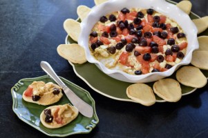 This requires baking, but it is one of those appetizers you can bring to someone’s house with the ingredients still in a shopping bag, arrange the ingredients in a pie plate, and then bake when needed. It will become a grazing station.