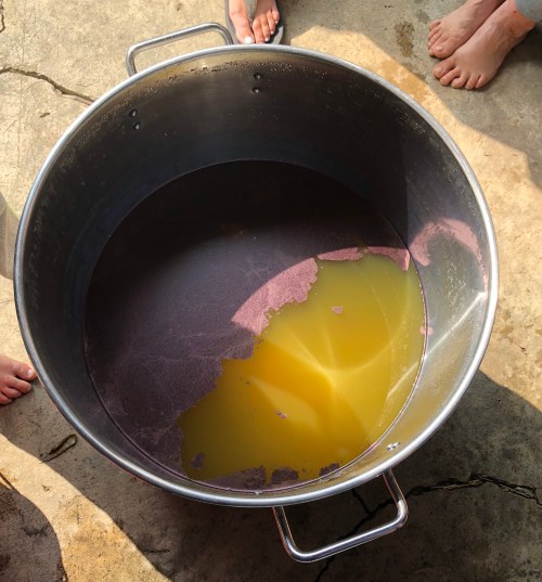 Robin scooped up a jar of the tea to show us the desired color. The indican molecules had broken down into blueish-indoxyl and sugar.