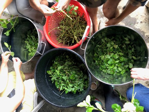 The black buckets were full of fresh stems, the red baskets held the stripped stems, and the two 80-quart stainless steel pots held the fresh leaves.