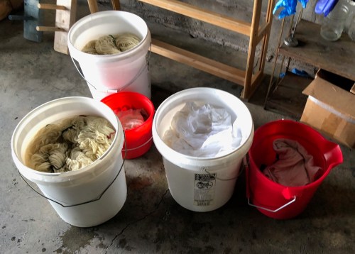 Before coming to the farm, Robin had asked us to wash the textiles we wanted to dye to remove all dirt and grease. She soaked them in warm water before we dyed them.