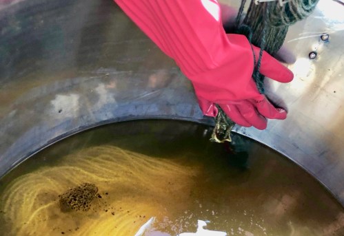 At 145º you could smell the wilted copper-tinged leaves and see why the dyebath is referred to as “indigo tea.” When the tea was 160º, we cut the heat. We put on heat-resistant gloves and used a short rake to scoop out the leaves and squeeze out as much liquid as possible. The leaves went into the orange compost bucket. The tea stayed in the kettle.