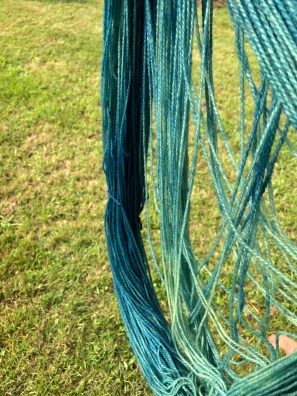 Give the yarn a bath in clean water and vinegar to set the color and then allow to dry. As an aside, notice the four ties spaced intermittently around each skein of yarn. That’s what keeps yarn from getting tangled while dyeing. In all of my years of knitting, I never considered why those ties were there.