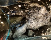 I removed and strained the leaves, alkalinized the dyebath, oxidated it for 20 minutes, and finally, reduced it for 2 hours in the kitchen sink.