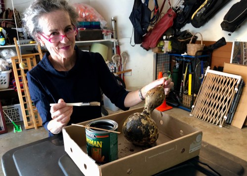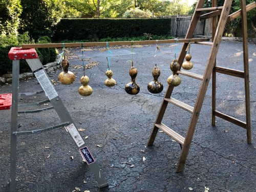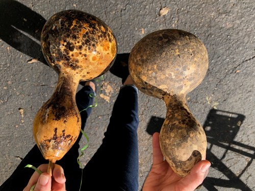 As instructed by Mary, I harvested the gourds before the first frost and allowed them to dry on a baker’s rack in my screened-in porch. Surprisingly none of them collapsed from rot. Mary dried her crop, over a six-month period, on a rack in her garage. You will know they are fully cured when you can hear the seeds inside rattle when shaken. Think maracas. They will mottle as they dry creating beautiful and desirable markings on the outside.