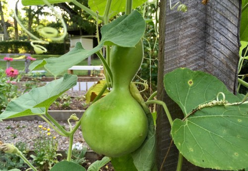 One summer, inspired by Mary, I grew bottle gourds in my backyard. I thought I had purchased seeds for pear-shaped gourds, but instead got this lovely bottle-shaped squash.