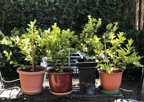 Thus inspired, in late April, when local nurseries started stocking lemon trees, my husband bought two Meyer Lemons and two Mexican Key Limes.