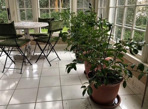 Here they are on October 21 after he re-potted them for the second time. He said he fertilized them once in the fall with Miracle Grow plant food for acid-loving plants. Since we had a mild fall, he kept them outside until mid-November.