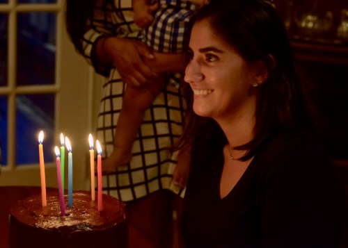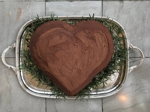 I used a pizza paddle to transfer the cake to my friend Kate’s silver tray. Her husband picked rosemary, and we added chocolate-covered ginger pieces for final adornments.