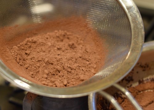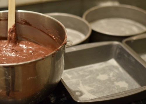 Add the cooled chocolate mixture to the blended sour cream and eggs. Beat briefly on slow speed for one minute. Scrape sides of bowl with a rubber spatula. Slowly add the flour mixture and beat briefly until just mixed. Remove paddle and stir batter up from the bottom with a spatula and fold until completely combined. Divide equally between the four prepared pans