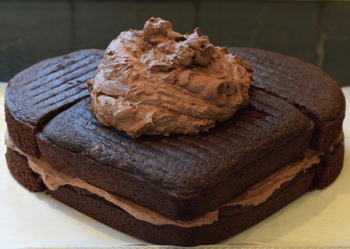 I made a rich ganache frosting. Ganache is a chocolate filling made with melted chocolate and heavy cream. Depending on the ratio of chocolate to cream used, the consistency of the end product can be either a dipping sauce, like for strawberries (1 part chocolate: 1½ parts cream); or a thick creamy cake frosting (1 part chocolate: 1 part cream); or a solid confection, like for truffles (2 parts chocolate: 1 part cream). I had to increase the frosting recipe by half to cover this more expansive version of the cake.